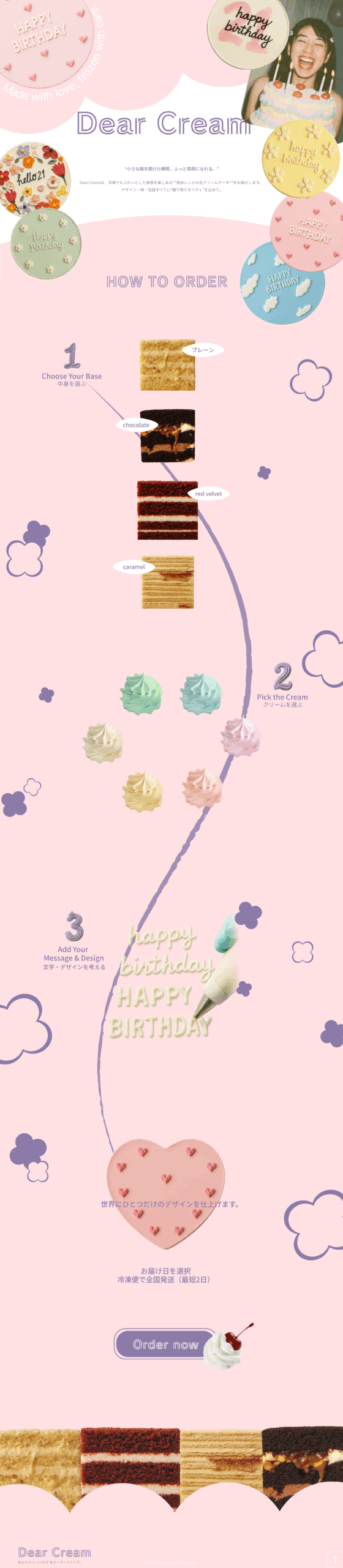 冷凍オーダーケーキブランド「Dear Cream」のLPデザイン。